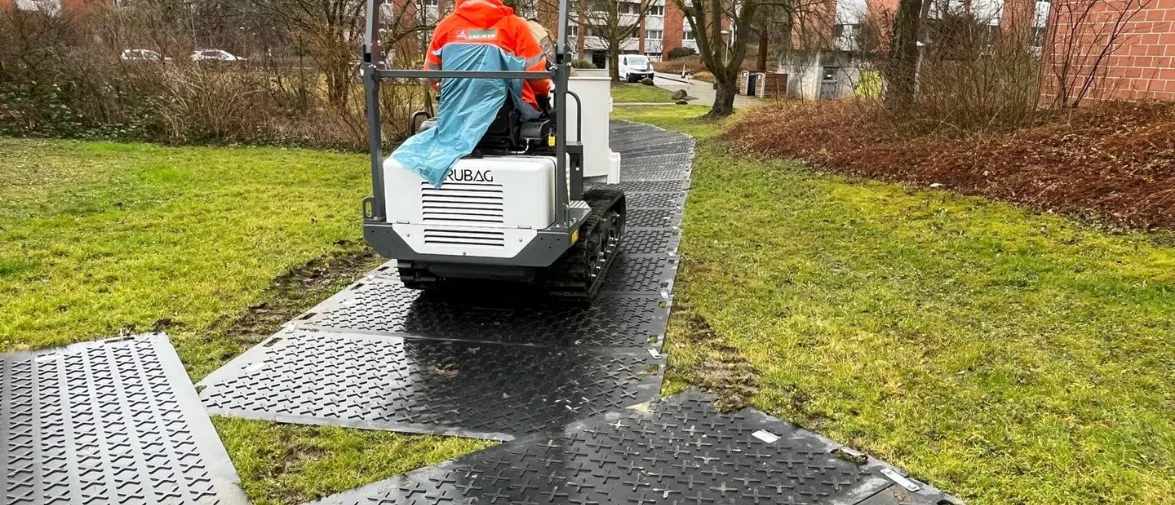 Im Garten- und Landschaftsbau muss häufig mit Maschinen und Geräten auf sensiblen Flächen gearbeitet werden – sei es im Park, auf Privatgrundstücken oder in Wohnanlagen. Ground Protect® Matten schützen Grasflächen, Wege und Pflaster vor Beschädigung durch Reifen oder Kettenfahrzeuge. Gleichzeitig bieten sie sicheren Halt für Maschinen und Personal. Perfekt für Arbeiten bei jeder Witterung, in Hanglagen oder bei eingeschränkter Flächenverfügbarkeit.